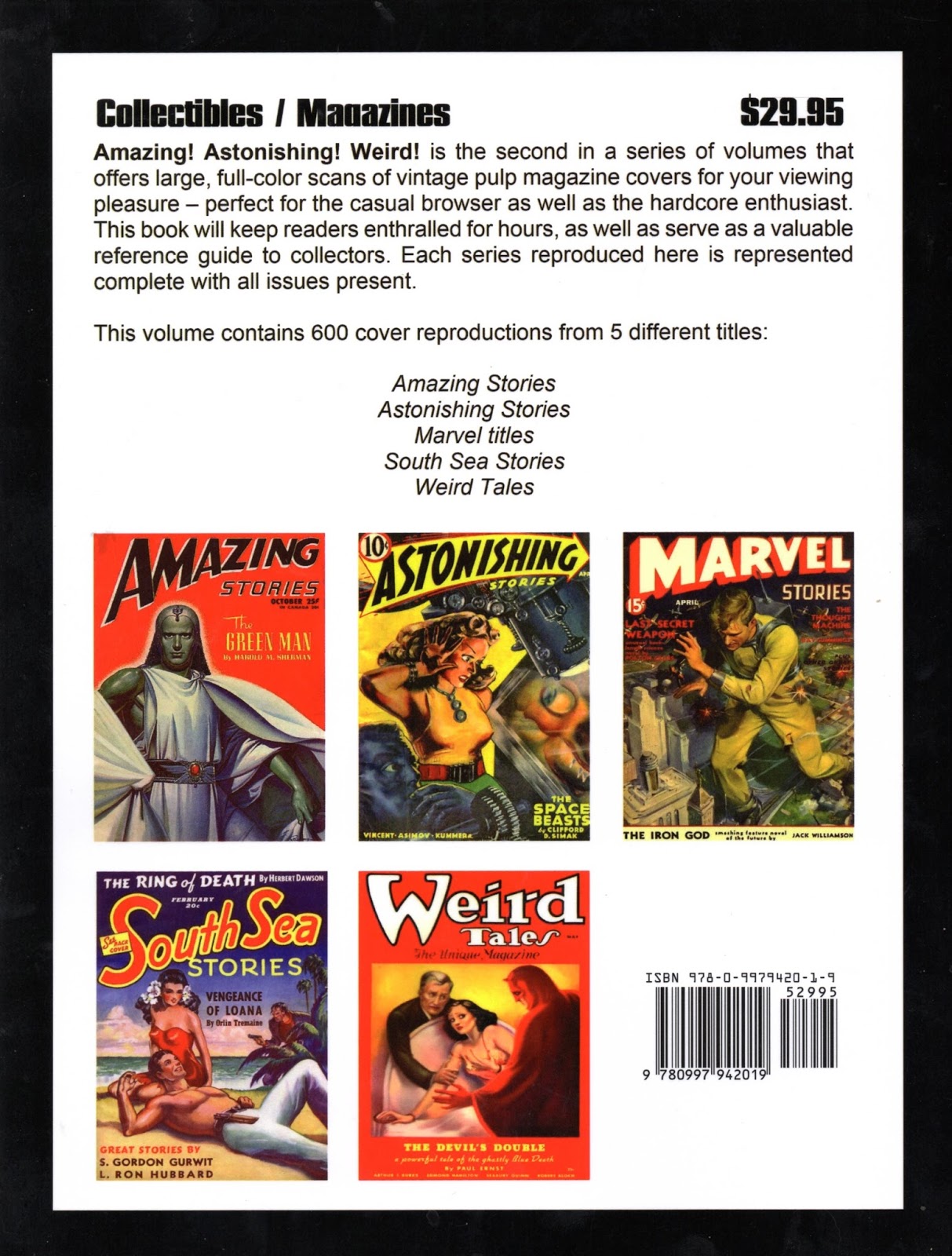 Todd Frye, author of four earlier picture-packed books (Fantastic Planets: The Complete Pulp Magazine Covers Vol. 1, Passion and Peril: The Complete Men's Magazine Covers Vol. 1, I Was a Teenage Monster Magazine Fiend, and Collecting Vintage Men's Magazines) has released this new one, presenting complete runs of cover images from Amazing Stories, Astonishing Stories and Weird Tales, with bonus pages devoted to the short-lived Marvel sci-fi mags, and even shorter-lived South Sea Stories.